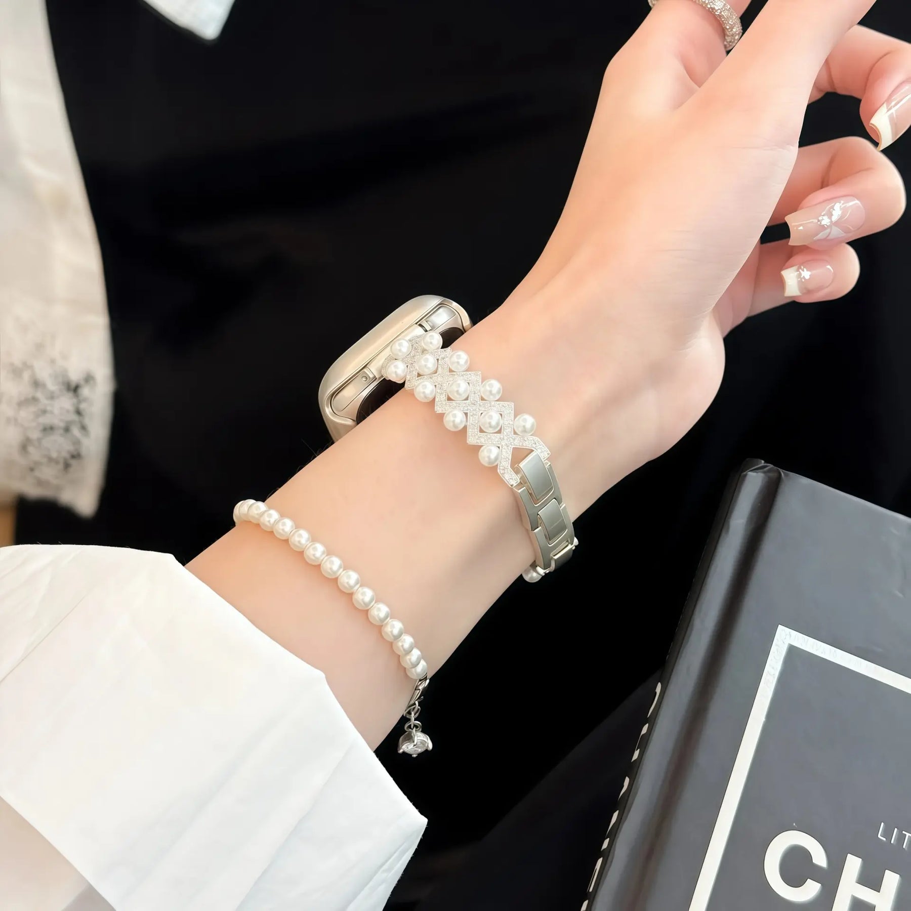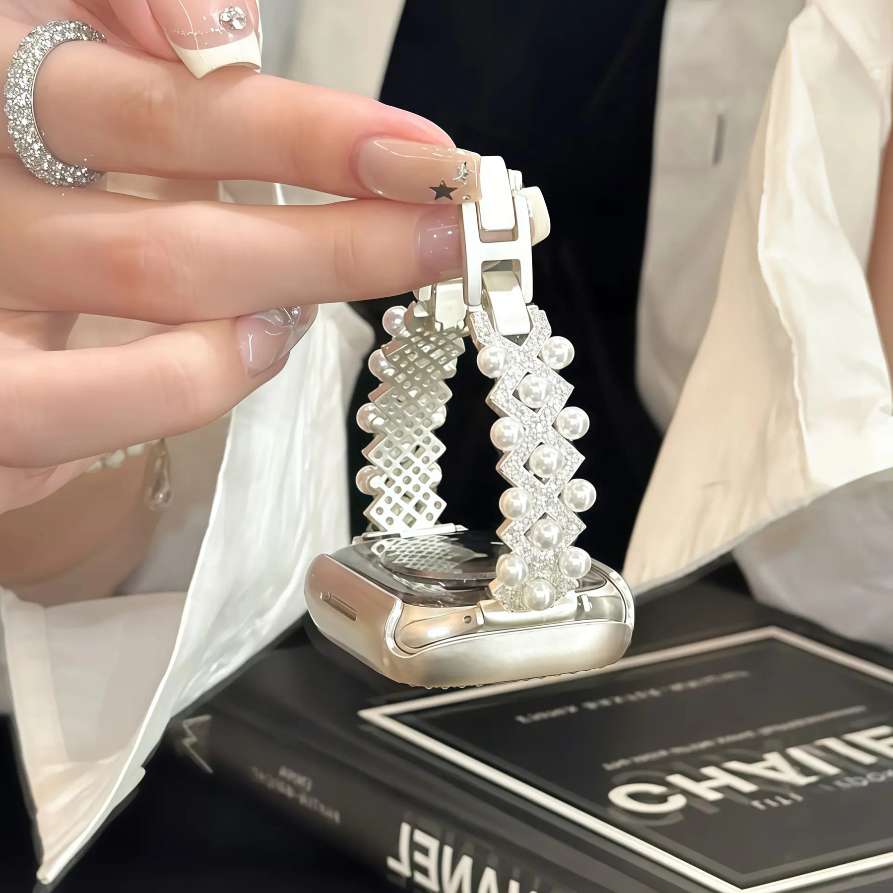 This dazzling diamond Apple Watch band perfectly blends classic elegance with modern style. The band is crafted from a combination of pearls and diamonds, each pearl and diamond encircling your Apple Watch like a thread of love, adding luxury and warmth to your wrist.
